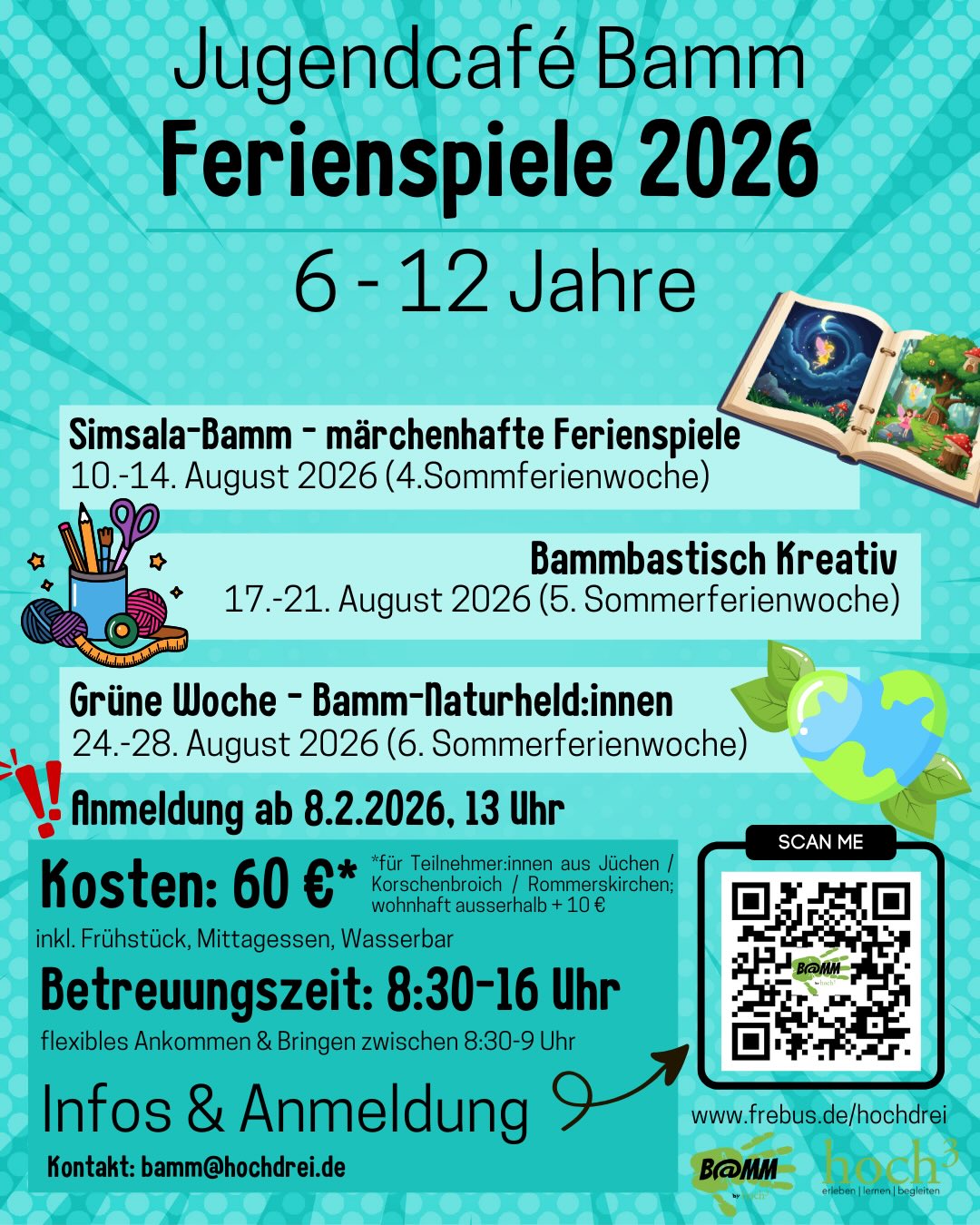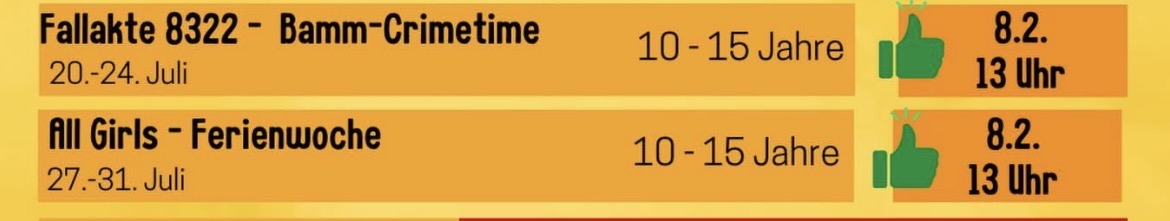Im Jugendcafé Bamm erwarten euch in den Sommerferienwochen vielfältige und kreative Ferienspiele. Die Betreuungszeiten sind von Montag bis Freitag, jeweils von 8 bis 16 Uhr. Kinder im Entwicklungsalter von 6 bis 12 Jahren sind herzlich willkommen, daran teilzunehmen. Seid dabei und erlebt eine tolle Zeit voller Spaß und Abenteuer!